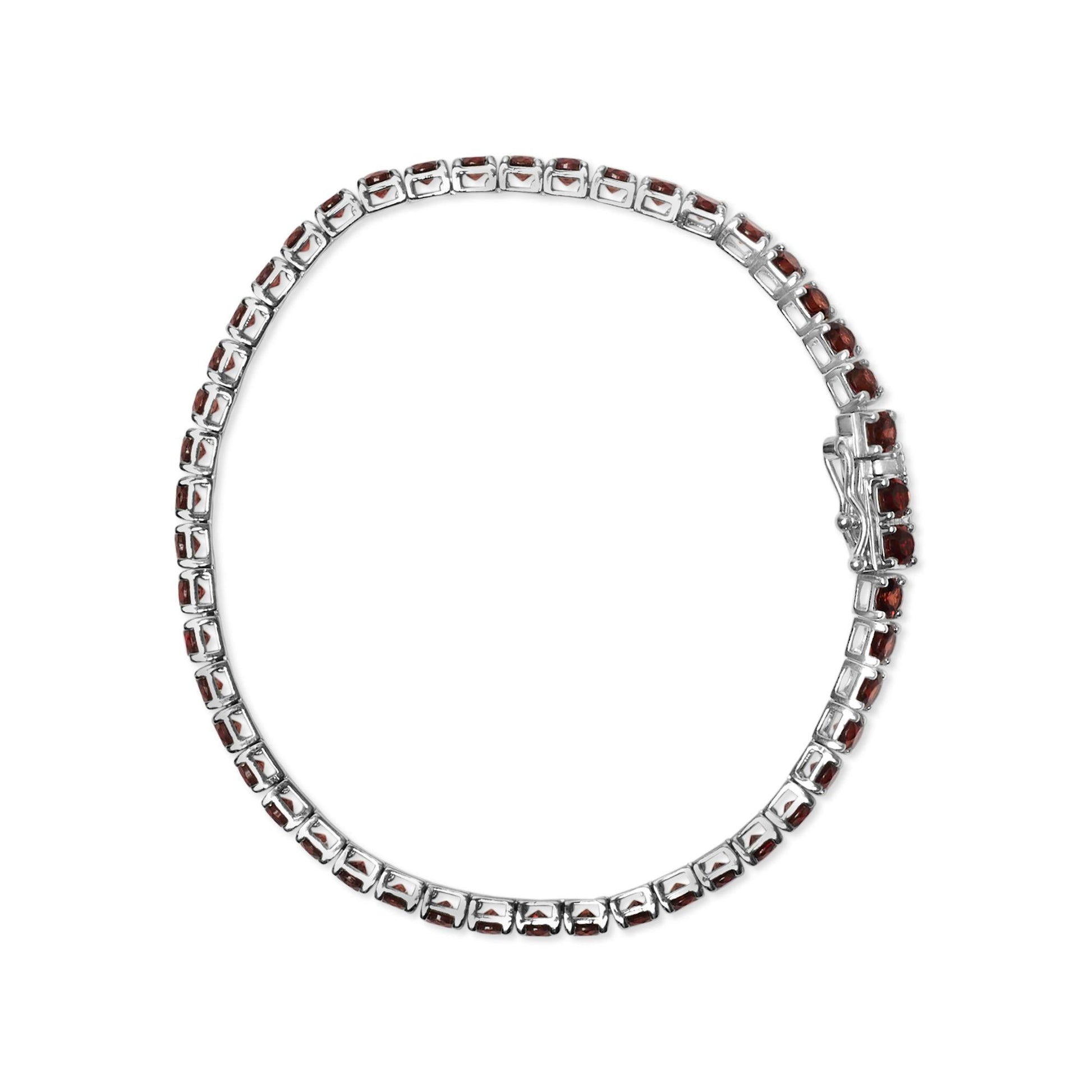 Immerse yourself in the warmth and vibrancy of the rhodium-plated .925 sterling silver tennis bracelet, where elegance meets a playful burst of color. Indulge in the opulent array of meticulously lab-created, color-treated orange garnets, each gemstone meticulously faceted to 3.5x3.5mm and securely nestled in a classic four-prong setting. This 7.25-inch masterpiece, designed to grace wrists with its seamless blend of timeless style and contemporary flair, features a robust box clasp and safety latch, ensuring it remains a steadfast companion in your collection. Let each turn of your wrist catch the light and reflect your exquisite taste, complementing any ensemble with its striking contrast and captivating sparkle.